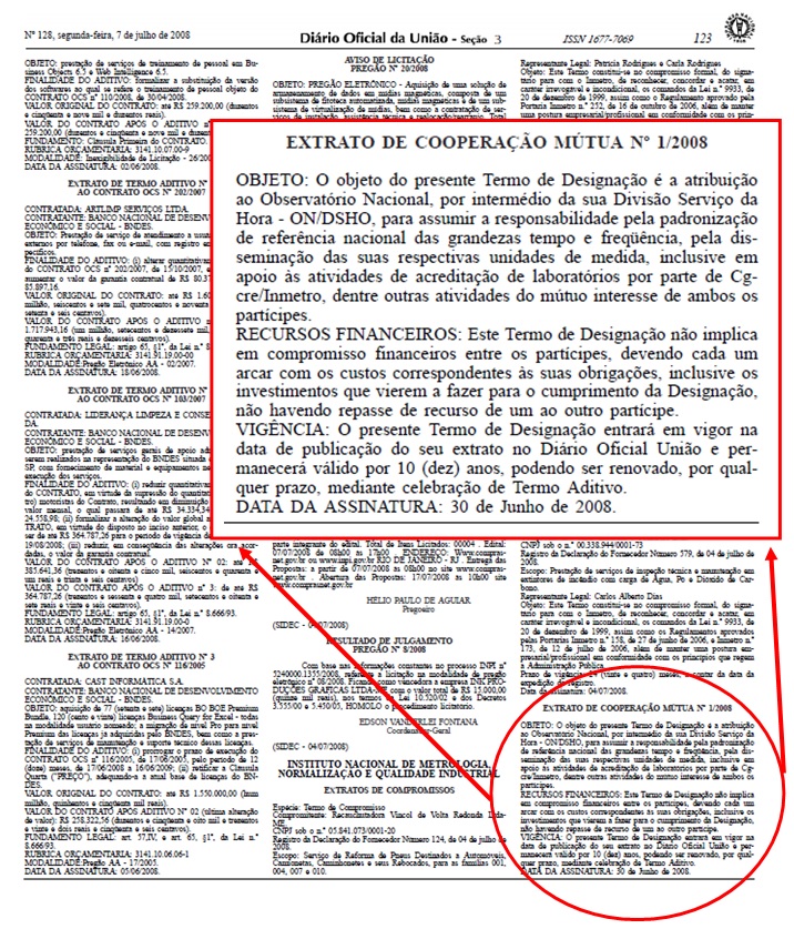 Por meio do Acordo de Cooperação Mútua número 1/2008, o Instituto Nacional de Metrologia, Normalização e Qualidade Industrial (INMETRO) designa a Divisão Serviço da Hora (ON/DSHO) como Laboratório Primário de Tempo e Frequência (LPTF) - responsável pela padronização de referência nacional das grandezas tempo e Frequência, pela disseminação das suas respectivas unidades de medida, inclusive em apoio às atividades de acreditação de laboratórios por parte de Cgcre/Inmetro, dentre outras atividades do mútuo interesse de ambos os partícipes. O extrato deste Termo de Designação está apresentado a seguir, tendo sido publicado no Diário Oficial da União (DOU), seção 3-página 123, em 07 de julho de 2008 e com validade de 10 anos.